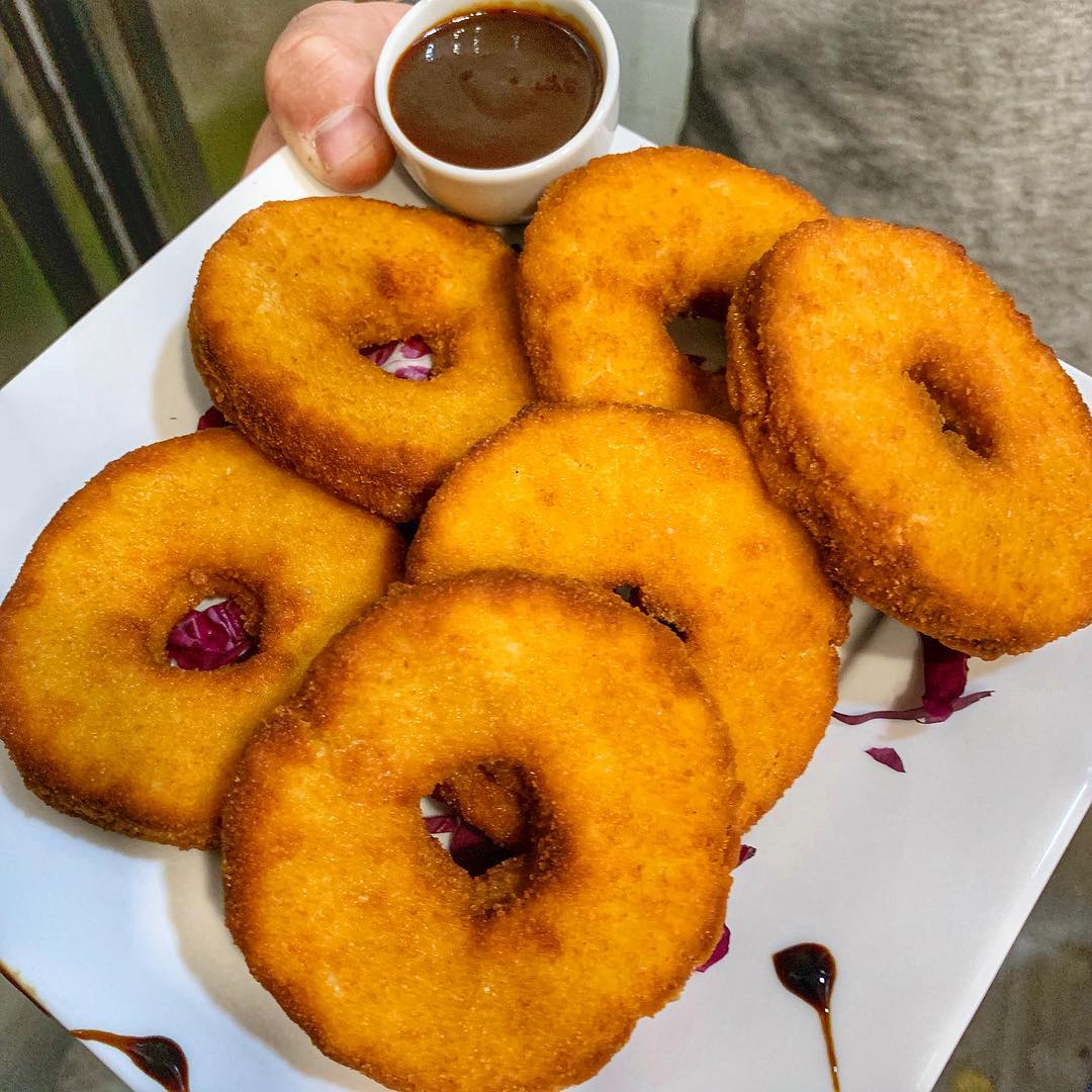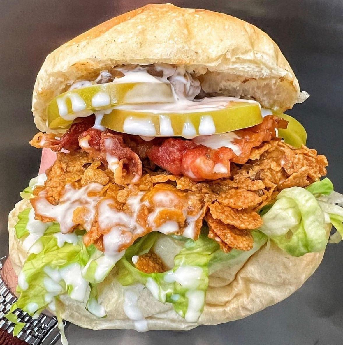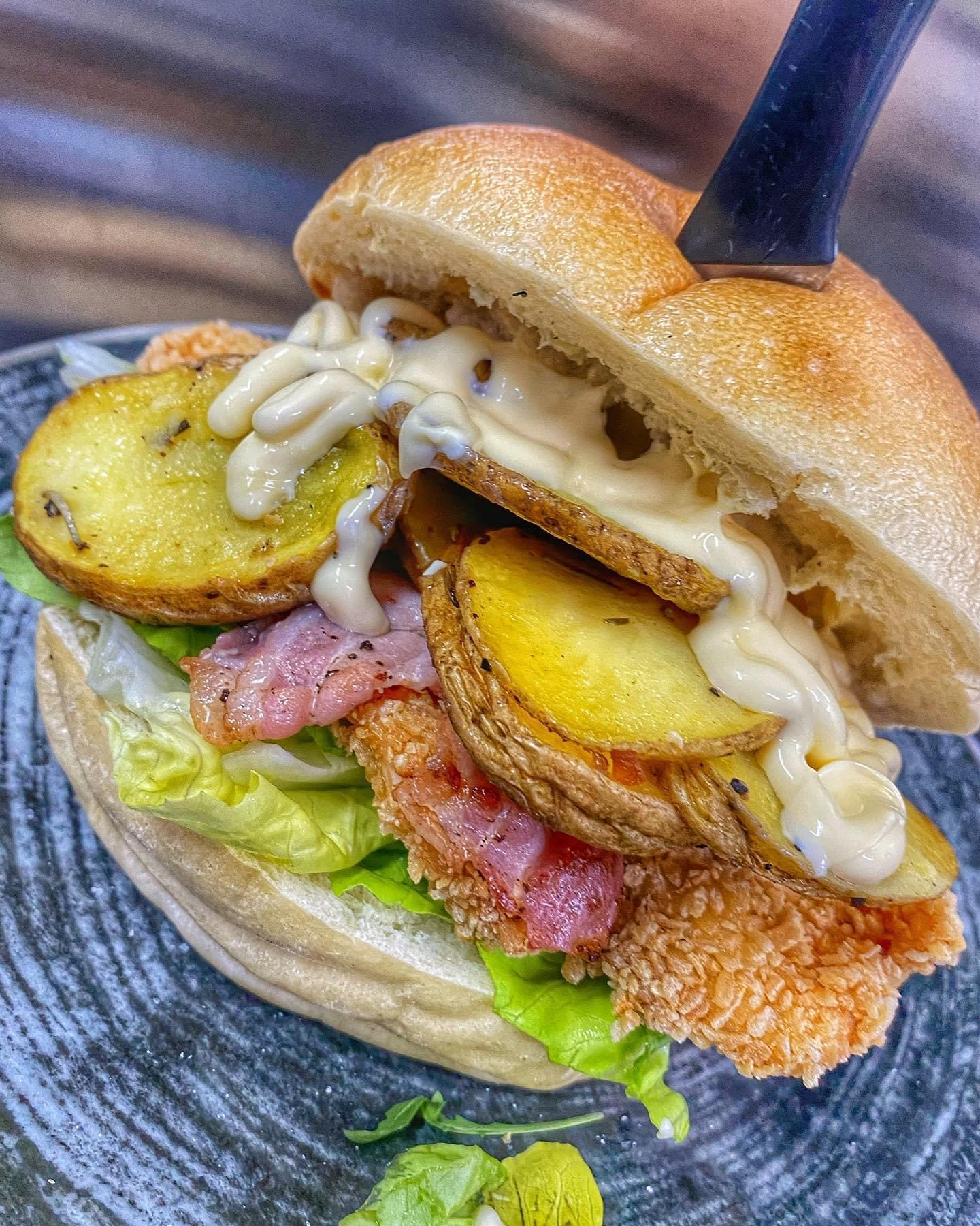 Hamburger di pollo impanato ai cereali, Insalata, Pomodori, Bacon, Cipolla caramellata, Salsa yogurt