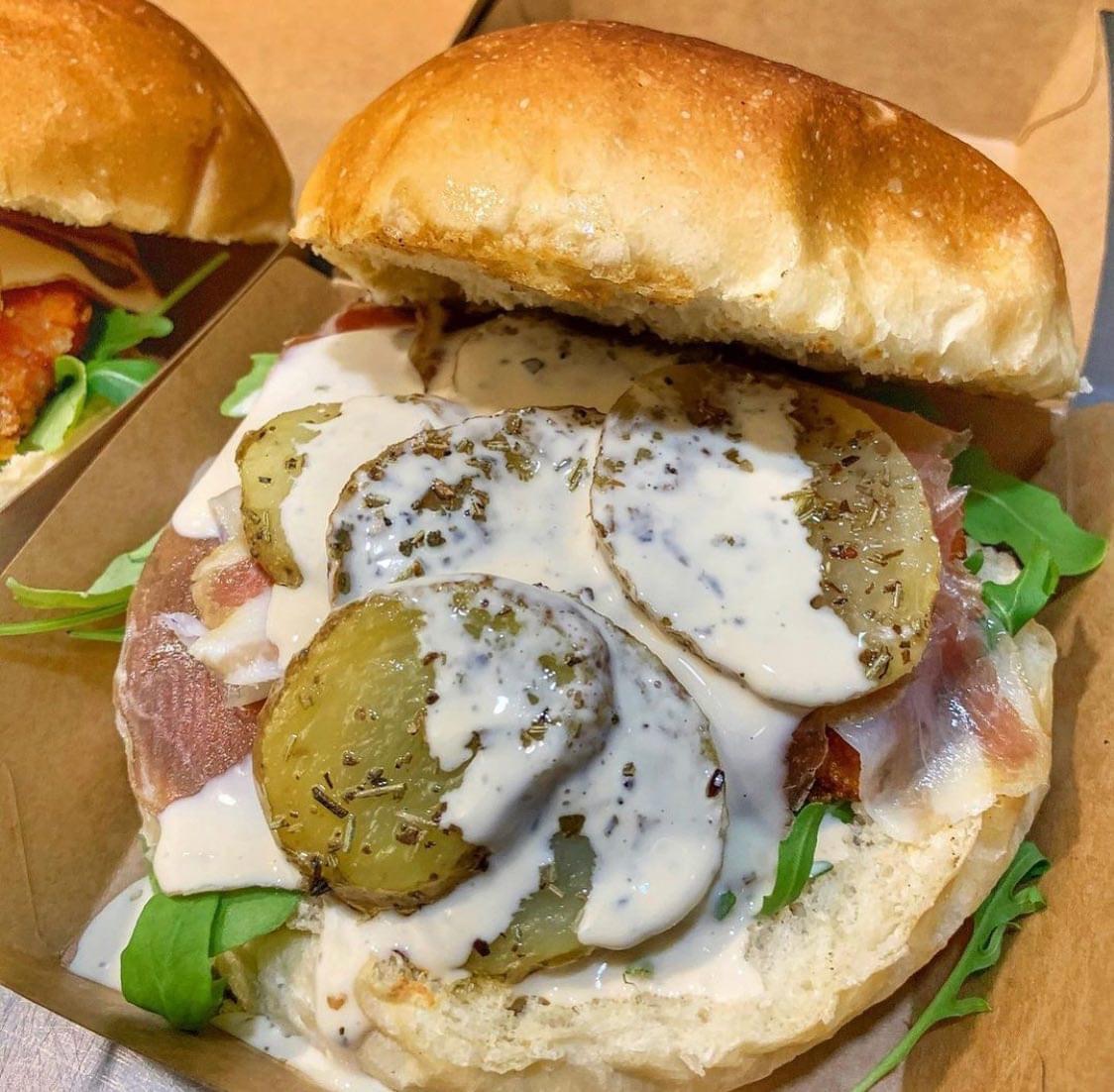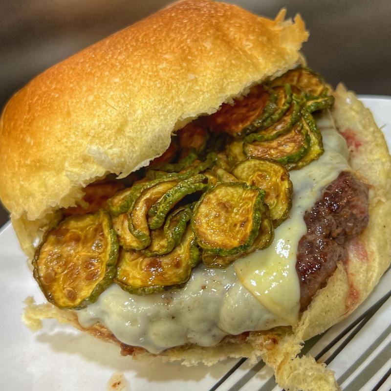 Hamburger, Provola, Prosciutto crudo, Zucchine alla scapece, Mayonese al basilico
