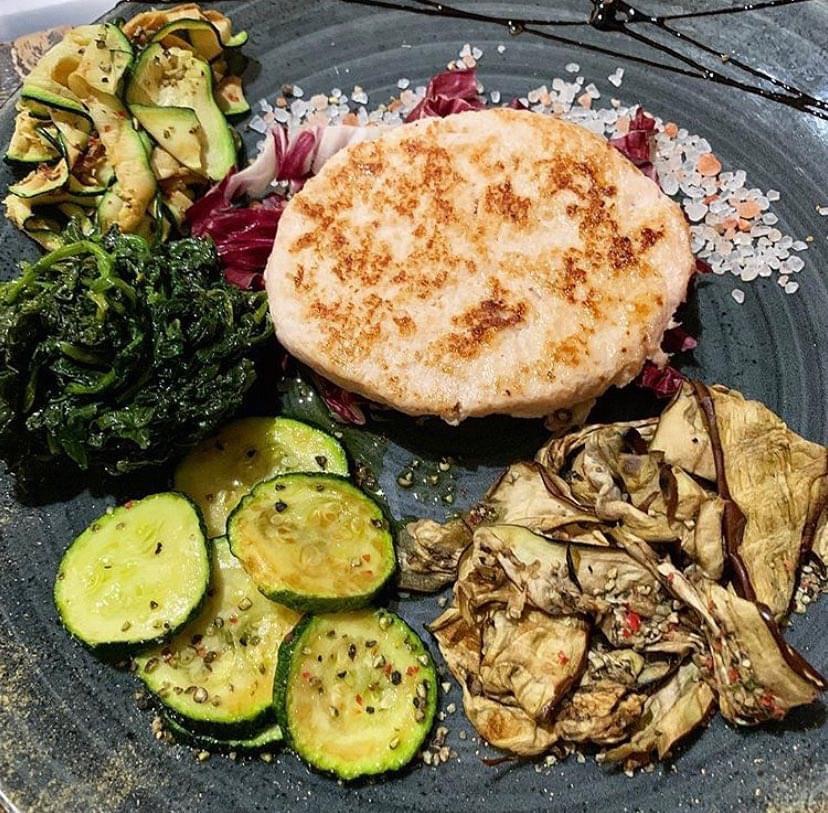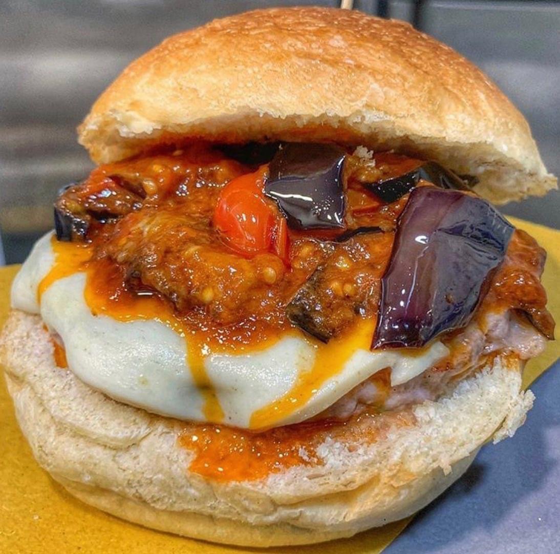 Hamburger vegano, rucola, pomodorini secchi, melanzane grigliate