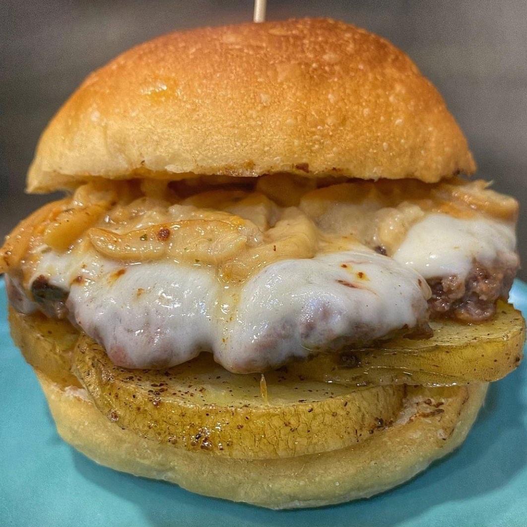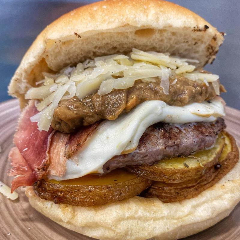 Hamburger di scottona 200gr, Provola, Patate al forno, Speck, Crema di funghi, Scaglie di Parmigiano Reggiano