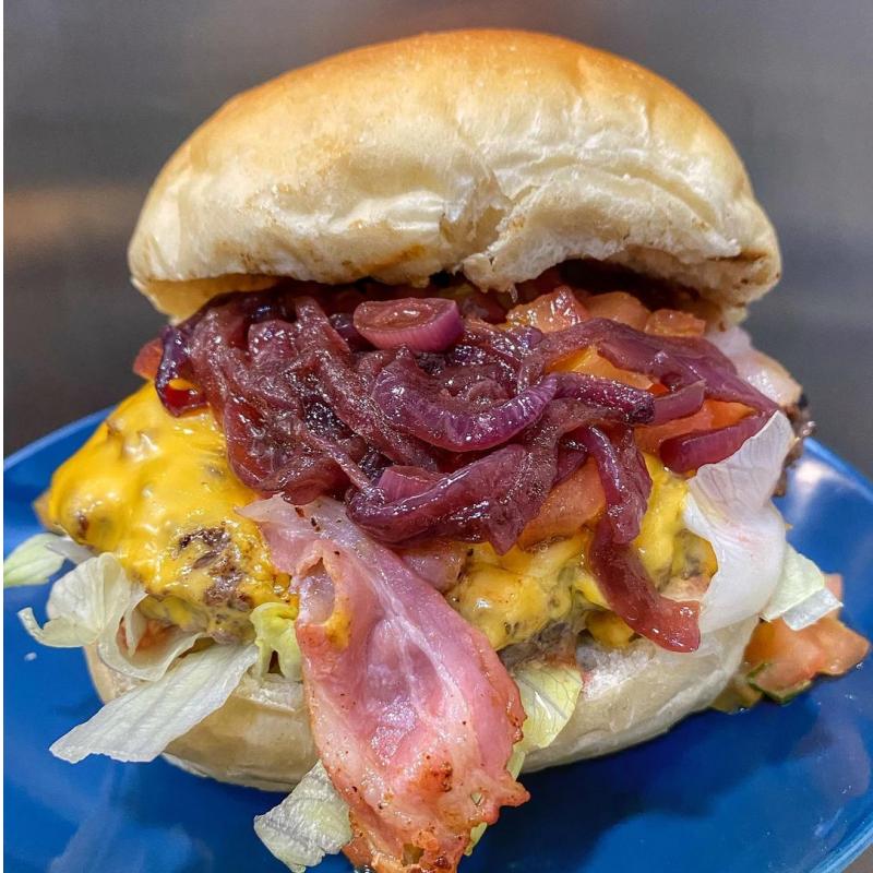 Hamburger di scottona 200gr, Cheddar, Pomodori, Insalata, Bacon, Cipolla caramellata