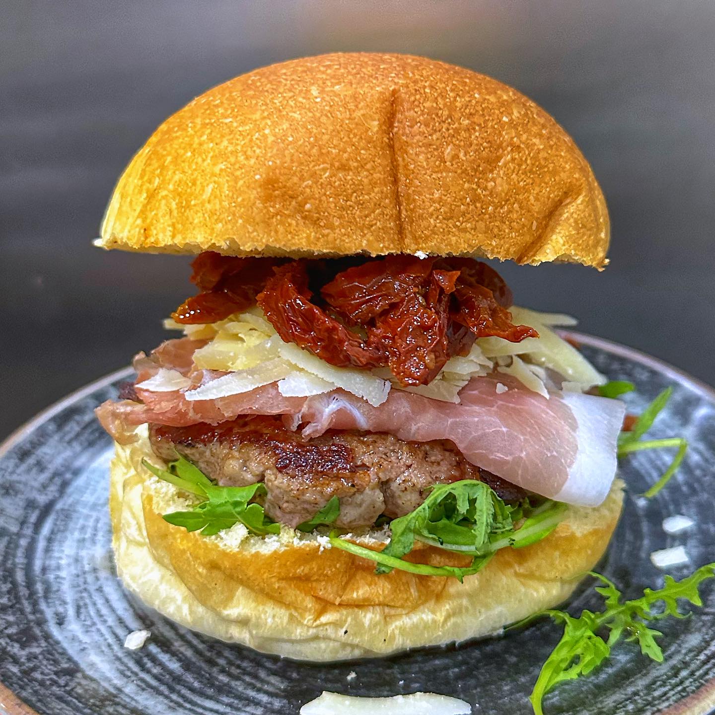Hamburger di scottona, Prosciutto crudo, Scaglie di grana, Rucola, Pomodori secchi
