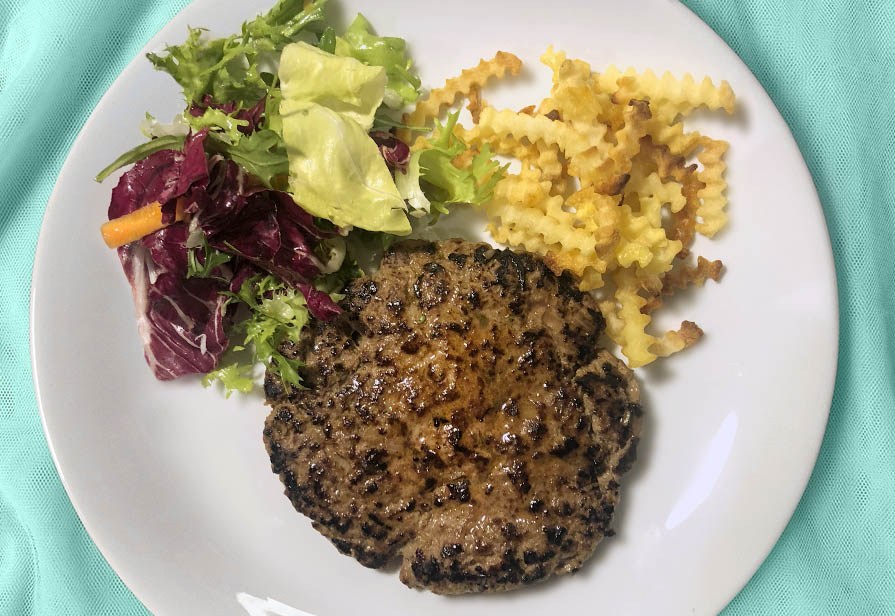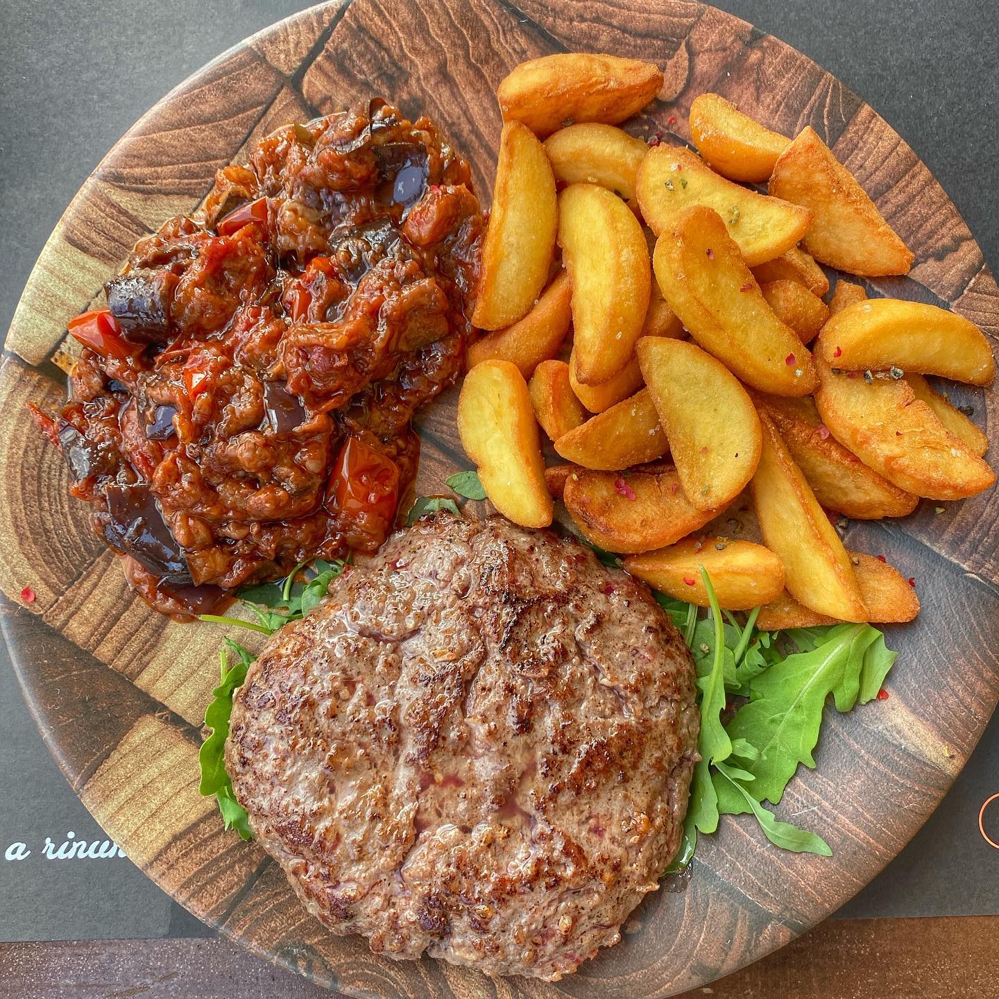 Hamburger di salsiccia 180gr, Provola, Melanzane a funghetto, Patate al forno