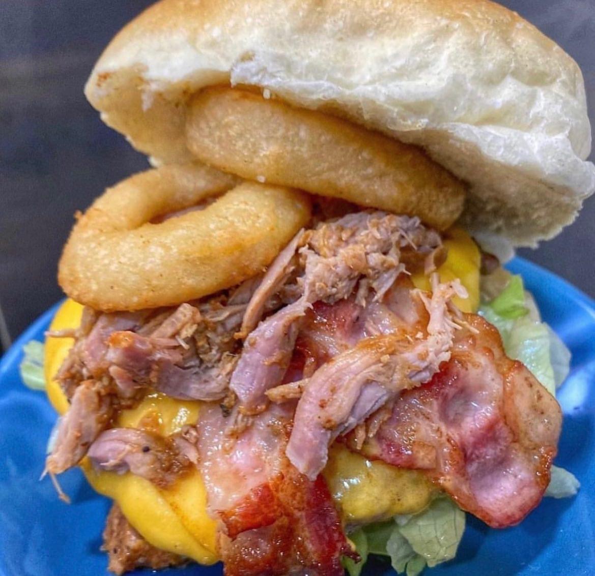 Hamburger di scottona 200gr, Cheddar, Pulled Pork, Insalata, Bacon, Anelli di cipolla