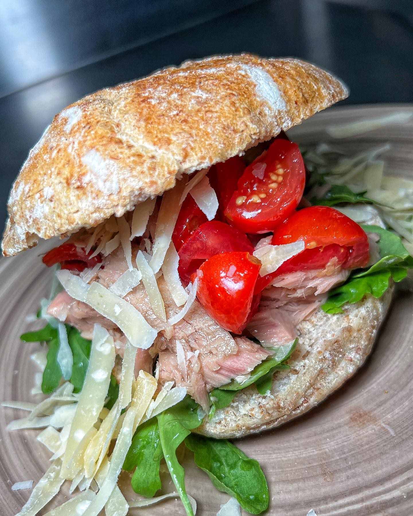 Filetto di tonno 150 gr., Rucola, Grana Padano 24 mesi, Pomodorini, Olive nere