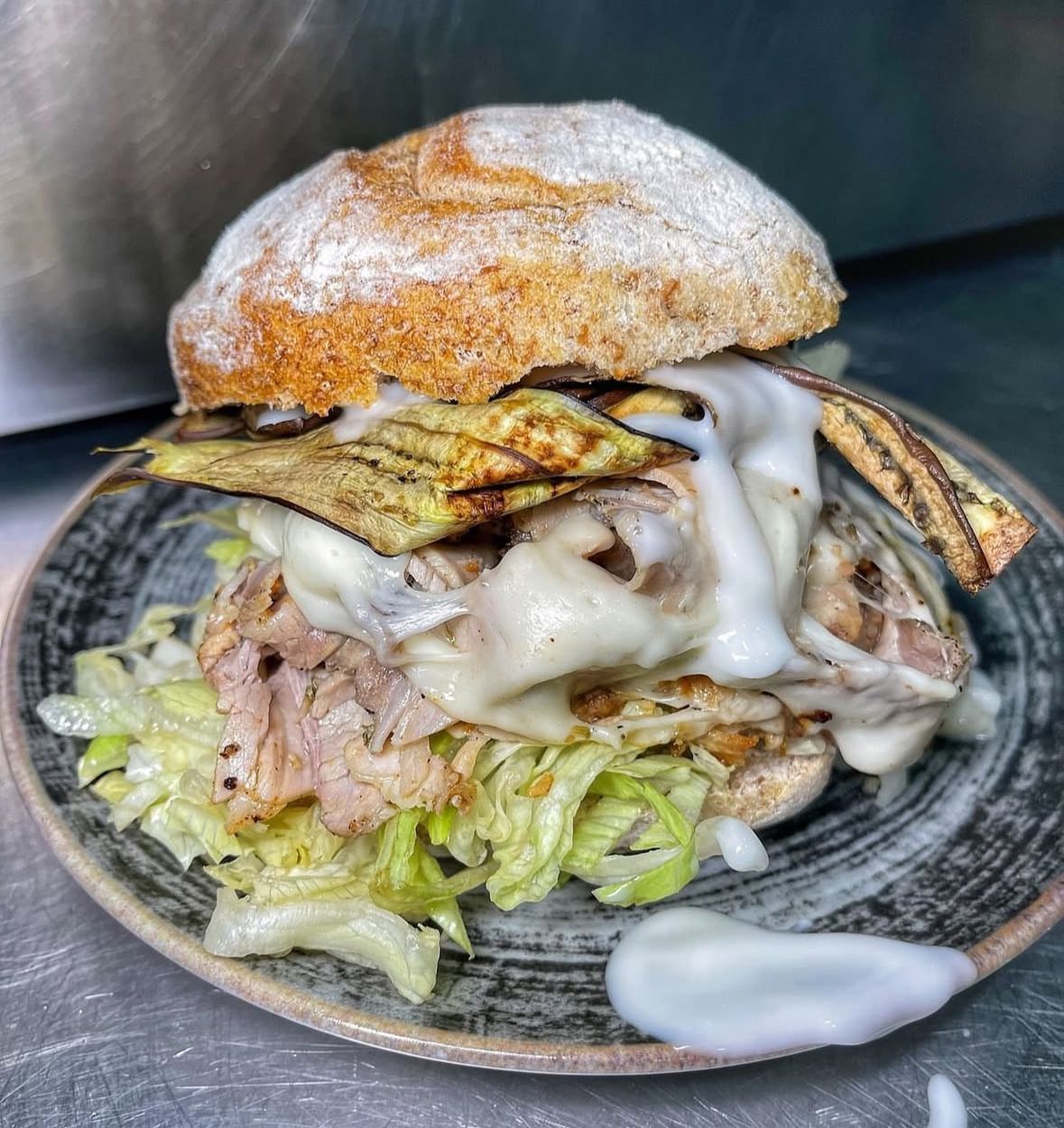 porchetta, insalata iceberg, melanzane grigliate, provola, salsa yougurt