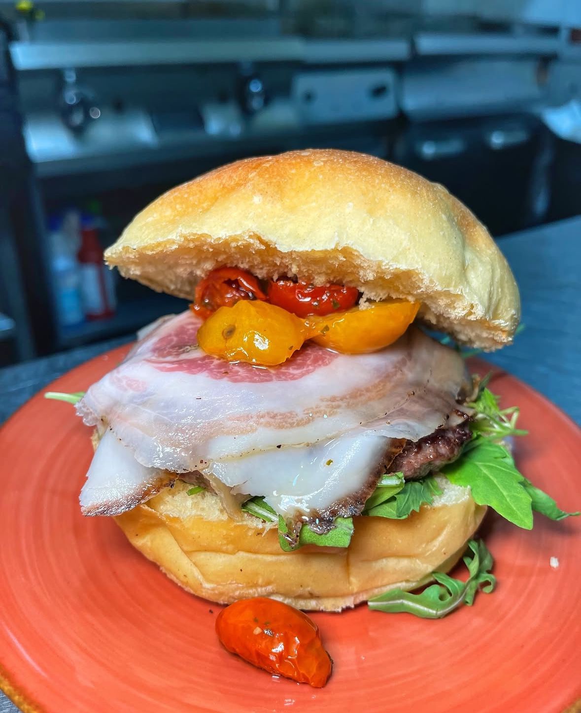 Hamburger, provolone del monaco, rucola, pomodorini semi-dry, pancetta fresca